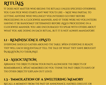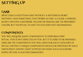 SOLSTUTIO SACER is a multiplayer tabletop roleplaying game for 2+ players where you become priests performing self-reflective rituals to eventually restore the Sun. Six objects—one from your past, one that makes you remember something else, one that embodies whatever “warmth” means to you, one that you use in everyday life, one that you've forgotten, and one that you love—become the basis for introspection shared with everyone else in the space.