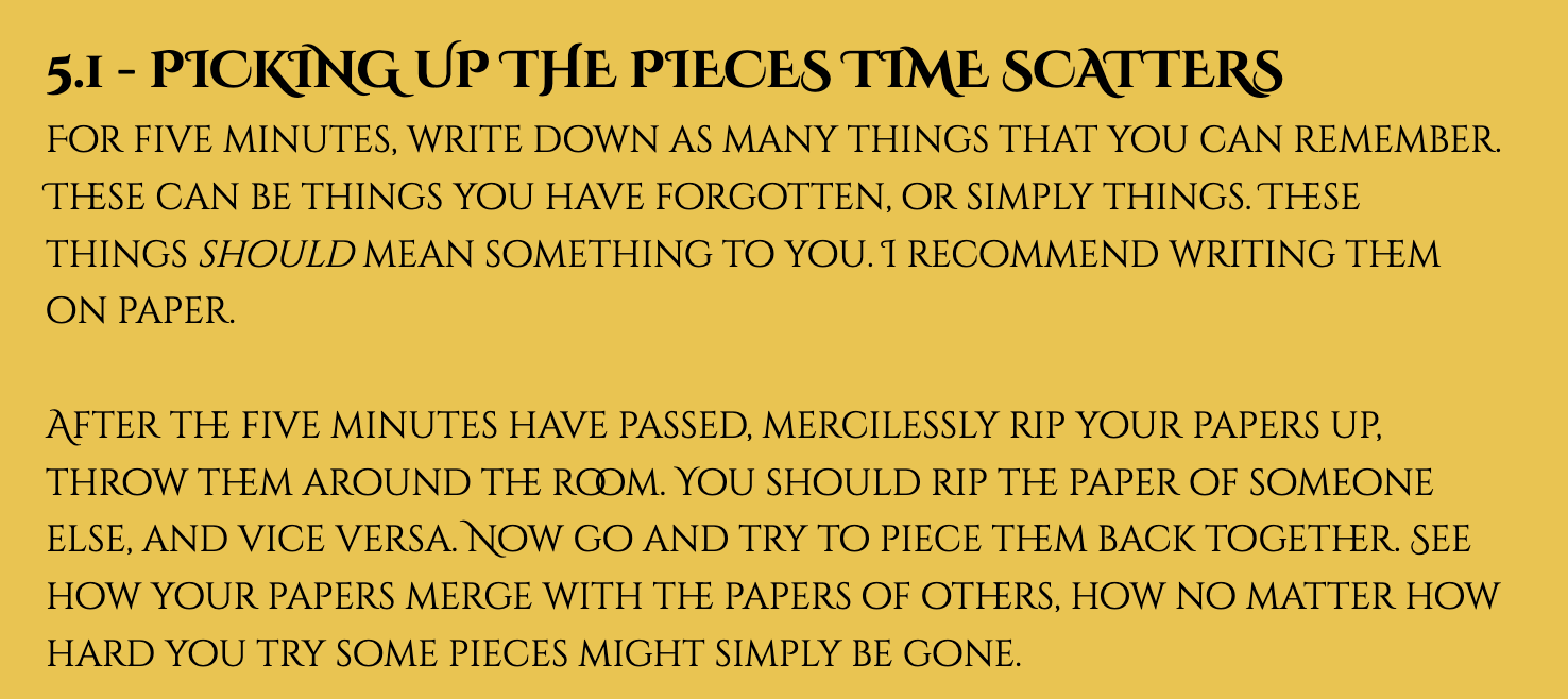 You will need: imagination, love, memories, a dark room, a light source, the six aforementioned objects, paper, pencils, and at least one other person with their own six objects.